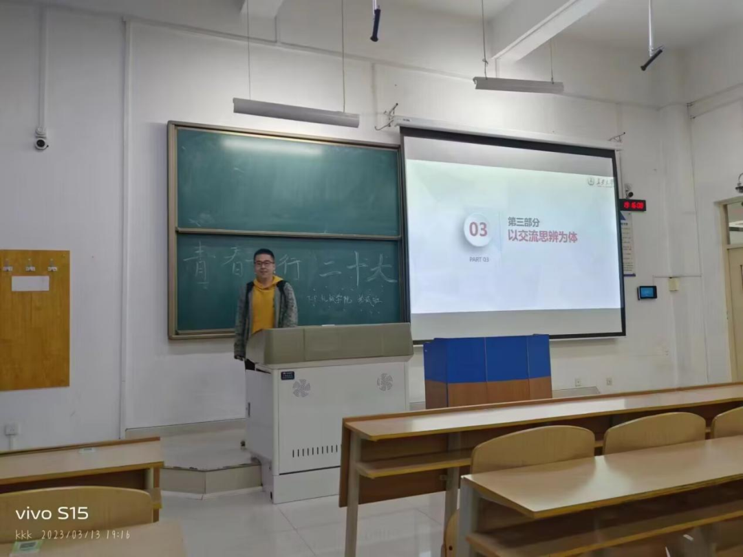 为深入学习党的二十大精神,引领同学们坚定理想信念,深刻认识到自己的责任与使命,对自己未来半年的学习有清晰的认识,2023年3月13日星期一,永利yl234112022250012班开展“青春践行党的二十大”主题班会,本次班会由班长黄磊主持,班主任苏燕芹老师参会并发言,班级全体同学参会。