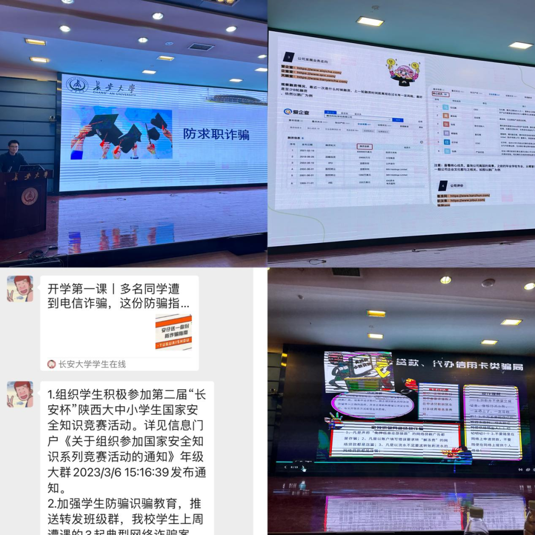 开展专题讲座,将防诈知识入脑入心。3月24日晚,学院于渭水校区会议中心二层报告厅举行防诈骗教育专题讲座,讲座邀请到雁塔分局反诈宣传员贾祎担任主讲人,学院党委副书记雷剑出席会议。贾祎从大学生群体最易受骗的诈骗类型谈起,对常见的电信诈骗套路以及受骗者的心理进行了剖析,同时结合发生在同学们身边的典型案例、毕业生求职过程中的陷阱等内容对如何识别、防范电信诈骗进行了分享。