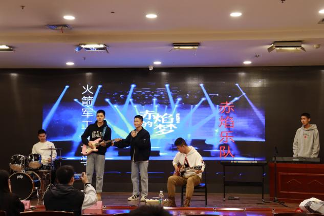 随后,来自火箭军工程大学的赤焰乐队拨弦转轴,首先演奏了一首《想去海边》,令人联想到放松的方式和惬意的生活节奏,带来舒适的听感;随即画风一转,演奏了一首《黑色柳丁》,充满黑暗色彩的旋律与主唱的歌喉完美融合;最后以一首《butterfly》作结,熟悉的旋律将观众带回童年,激烈的鼓点将活动推向高潮。